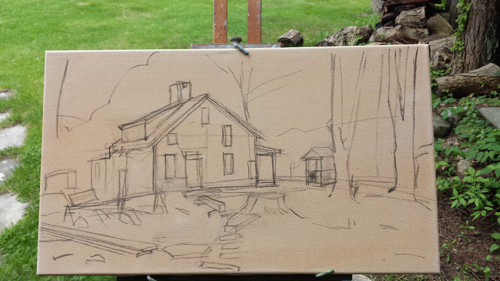 I work with oil paints, and my "en plein air" process typically starts with a charcoal sketch on a "ground canvas" ...then progresses to a loose-wash underpainting, then I build in more details using light and dark forms, refine colors and linework, and finally add subtle details as time or focus dictates. Each painting takes on a life of its own.